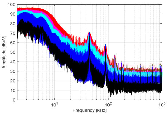 EMI receiver spectra with variable RBW (200 Hz, black; 1 kHz, blue; 2 kHz, light blue; 3 kHz, magenta; 5 kHz, red) for a SMPS featuring fixed switching frequency (type Black at 90% of rated power).