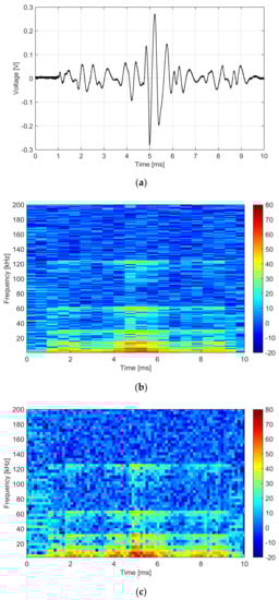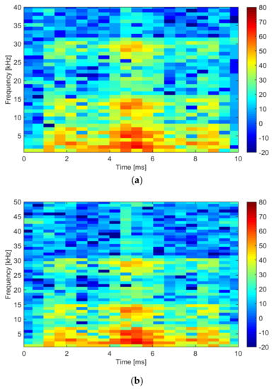 The time resolution of both WPT spectra in Figure 5b,c is superior to that of STFT tracking the signal with 500 μs and 125 μs steps, respectively; considering the visible signal dynamics and what is offered by alternative approaches (such as a narrowband DFT or a real-time spectrum analyzer), a time step in this range is more than adequate. Correspondingly, the frequency resolution also varies by a factor of 4 in the opposite direction: when using 976 Hz in Figure 5b, the low-frequency portion of the spectrum is enriched with the details between the second and the sixth bin, which hold alternatively the maximum of the spectrum around t = 5 ms; this is evident from the asymmetry of the half-cycles of the oscillatory spike in the center of the waveform of Figure 5a. The comparison of the estimated amplitudes for the two spectra with different frequency and time resolution indicates that a finer time resolution gives slightly larger amplitudes (Figure 5c), avoiding the averaging implicit in a larger time interval. This behavior is common with the DFT and is hardly predictable quantitatively, as it depends on the characteristics of the signal components (narrowband/broadband and steady/transient). The average of four adjacent time bins in Figure 5c gives approximately the value of one bin of Figure 5b (within 1 dB). Nonetheless, the maximum value can differ by up to 3.4 dB, as occurring in the first frequency bin at 5 ms; this represents then the maximum absolute error between the two spectral representations.