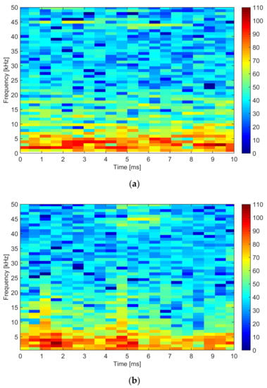 As observed for the EEMD in Section 3.3, the best amplitude accuracy is reached for the faster components (those at about 44 and 88 kHz) that have better localization in both time and frequency: in this case, agreement for different frequency and time resolutions is within 0.6 dB for the results shown in Figure 5 (confirmed by some other tests done on different SMPSs). For nonstationary low-frequency components, the reference measurements themselves for assessment of accuracy are deemed by variability and uncertainty caused by the very nature of the signals.
