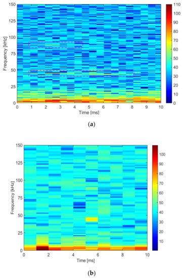 The two areas encircled by the pink rectangles are those of the 44 kHz and 88 kHz components, for which the WPT provides a thorough tracking (see Figure 8a), better than that appearing in the STFT spectrum (Figure 8b). The comparison between WPT spectrum and STFT shown in Figure 8 reveals that: