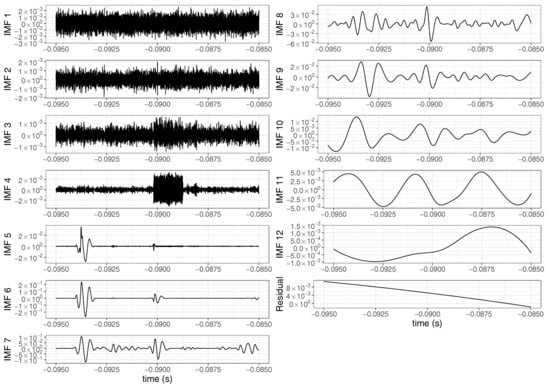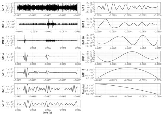 The iterative process of extraction of the IMFs through the EMD method is called the sifting process. The first IMF contains the highest oscillation frequency in the signal. The difference between the original signal and the first IMF is called a residue. The residue is then considered as new data to decompose and the sifting process is applied to it; the same definition thus applies to the difference between the previous residue and the last IMF at later stages. The sifting process must be repeated until the extracted signal (the candidate IMF) satisfies the IMF definition or the predefined maximum number of iterations is exceeded. The number of extrema decreases as the decomposition proceeds, and the sifting process ends when the residue becomes a monotonic function or a function with only one extremum from which no further IMF can be extracted [23] (in other words, no oscillations are contained in the residue). At the end of the decomposition, we have N IMF functions and one residue, and the original signal x(t) can be reconstructed as