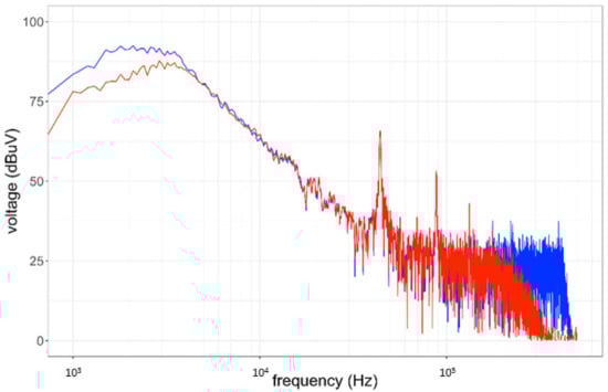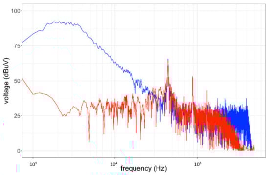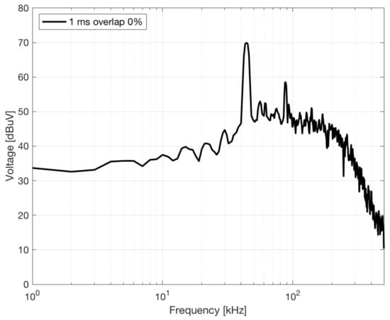 It may be objected that an EMI receiver scan returns the reference spectrum, since after all it is the reference method adopted by EMC standards, against which we check the compliance of emissions. The “EMC” resolution bandwidth (RBW) values of 200 Hz and 9 kHz used, respectively, below and above 150 kHz have been considered as a starting point, assessing the variability of the measured spectrum by changing RBW from 200 Hz to 1 kHz, 2 kHz, 3 kHz and 5 kHz, looking for a compromise between a neat frequency resolution and an accurate amplitude estimate. The results are reported in Figure 4 showing a progressive increase of the noise floor (as expected), a substantially stable amplitude of the switching peaks at 43.3 kHz and 87 kHz and above, and a variable estimated amplitude for the low-frequency nonstationary components (with a behavior similar to that of background noise). The result with 1 kHz RBW is retained for further analysis as a good compromise, also in view of the necessary time resolution settings in STFT and WPT.