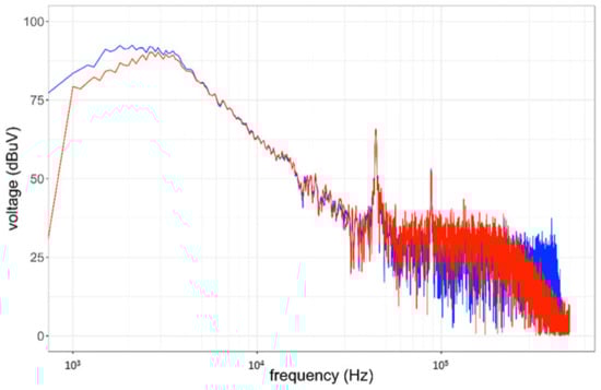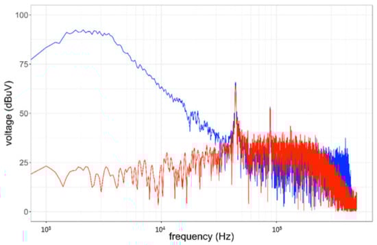 The EMD and EEMD were used in the R interface implementation Rlibeemd [30,31]. The measured voltage is analyzed first using EMD. As the boundaries of the signal may affect the decomposition of EMD-based algorithms [32], to avoid boundary problems, particular care was taken in the choice of an appropriate time record of 10 ms. Figure 9 shows the 12 IMFs extracted from the original signal. As demonstrated in [33], the EMD performs as a filter-bank sifting out the high-frequency harmonics first, whereas the low-frequency ones pass through the filter. IMFs 2 and 3 contain the information needed to represent the significant part of the frequency spectrum, i.e., the three peaks corresponding to the switching frequency (about 44 kHz) of the SMPS and its second and third harmonics. IMF 2 contains the information related to the second and third harmonics of the fundamental frequency, whereas IMF 3 contains the information of the switching frequency. Performing a FFT on the sum of these two IMFs yields the red spectrum in Figure 10, whereas the blue spectrum is the FFT of the original signal. A Flat Top window is applied to the original signal and IMFs in order to maximize the amplitude estimate [15].