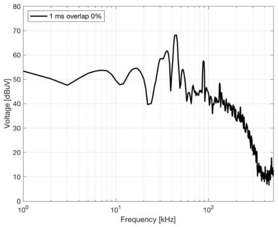 - The signal portion to analyze has a short duration, which contrasts to the desirable or required frequency resolution. The IEC 61000-4-7 standard [29] indicates an observation time of 200 ms that is clearly inadequate (equivalent to 5 Hz resolution, suitable for low frequency harmonics, but not for phenomena at higher frequency with fast dynamics, as in the present case). The EN 55065-1 [14] and in general EMC standards for conducted emissions below 150 kHz require a 200 Hz resolution bandwidth. A more suitable approach has been proposed in the IEC 61000-4-30 [13], defining a frequency resolution of 2 kHz, which goes in the direction of tracking signals with fast dynamics, as in the present case.