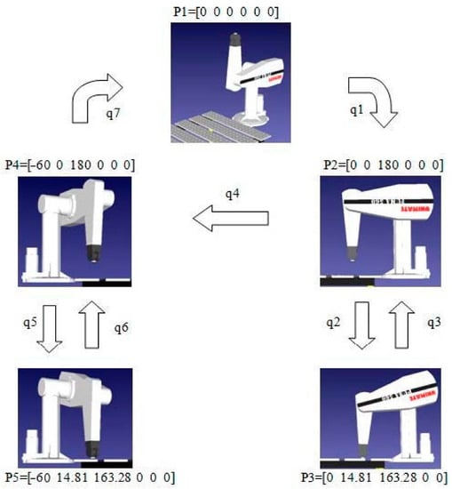 Repeating the procedure for the remaining positions, we obtained many individual trajectories, which were merged into the final trajectory. The final trajectory consisted of seven individual trajectories (q1–q7) between the positions (P1–P5).