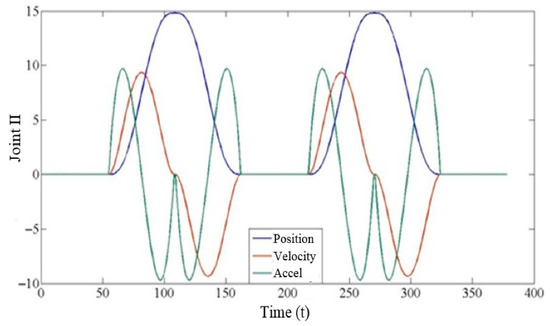 The diagram (Figure 4) shows the generated trajectories for just one axis (II joint), which contain all the trajectory components: position (blue curve), velocity (red curve) and acceleration (green curve).