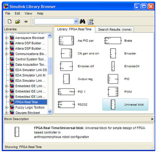 - Jokic, D.Z.; Lubura, S.D.; Stankovski, S. Universal block for simple design of FPGA based controller in anthropomorphous robot configuration. IFAC-PapersOnLine 2015, 48, 135–140. [Google Scholar] [CrossRef]