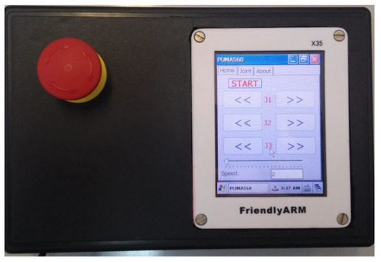 Robot programming using a simulator is a well-developed, popular method. However, the values for the positions obtained in the simulator are to a greater or lesser extent not in line with the real values. This problem is successfully solved by manually bringing the robot to the desired position using the control console. As the issue of signal acquisition and processing was solved entirely by the Encoder Interface block [29], the idea which presented itself was to use the Teach pendant, which emulated the default values of the positions for all three robot axes as encoder impulses. The simple Teach Pendant is presented in Figure 7.