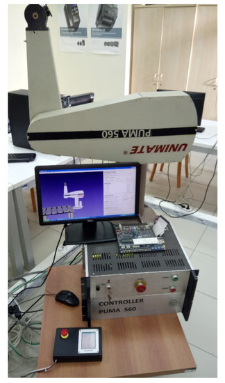 - Jokić, D.; Lubura, S.; Rajs, V.; Bodić, M.; Šiljak, H. Two Open Solutions for Industrial Robot Control: The Case of PUMA 560. Electronics 2020, 9, 972. [Google Scholar] [CrossRef]