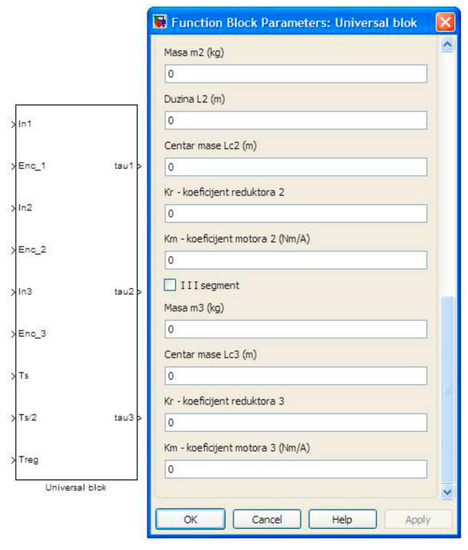 Figure 10 shows the interface of the critical component for this control structure, the Universal block for controlling the anthropomorphous three-axes robot configuration. It has three PID regulators, accompanied by a gravity compensation component for the second and the third axes, following the scheme in Figure 9. Its inputs are basic robot parameters (mass, length and centroid position of the segments, as well as motor and transmission coefficients) and PID controller parameter values. Using the FPGA Real Time Toolbox (Figure 6), it is possible to tune PIDs online, one axis at a time; here, the idea was to test the PID controller parameters for every axis, with the blocks from the Robotics Real Time Toolbox. The customization of the basic robot parameters allows for the realization of a complete three-axis control for any anthropomorphous robot.