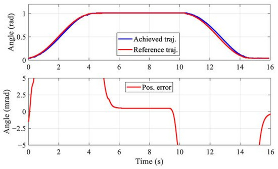 As a test for following and reaching the desired position for the robot axes, we realized a trajectory using a seventh-degree polynomial (employing the function jtraj). The task was reaching 1 rad and returning to the starting position, and a sample result of this experiment is shown in Figure 11. Depending on different experimental conditions, the error in the steady-state varies: the maximum error that we observed at the steady-state was 1.2 mrad, but usually the errors were under 1 mrad (as depicted in Figure 11) and realistically suitable for industrial purposes.