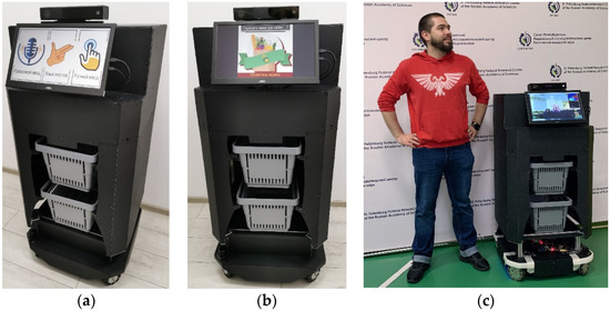 Based on the above-mentioned platforms, it can be seen that the idea of assistive robotic carts implementation is not new and has been of high importance for a considerable period of time. Despite the active use of different contactless ways of interaction of the user with the robotic cart, none of the platforms described above makes use of a gesture interface. Combination of gesture and speech modalities are found even more rarely, with no previous study found in the literature for Russian sign language recognition by robots. Currently, the only Russian sign language recognition/synthesis system that has gained popularity is Surdofon [44], which combines software solutions and online service tools for the translation of Russian sign language into Russian-sounding language. However, Surdofon does not actually recognize gestures (except for the online service, with human signers engaged in translation): a deaf or a user with hearing disabilities has to use the textual modality in order to input information, while the tool answers in spoken Russian, which is converted into sign form using the application. Efforts are being made to develop assistive robots, which can interact with the user via sign languages [45,46,47], but none of them combine assistive technologies. At the same time, supporting people with hearing impairments using assistive technologies is of significant importance. Only in Russia, according to the 2010 census, more than 120 thousand people were using sign language to communicate in their everyday life. Moreover, the use of gesture modality substantially expands the possibilities for human-machine interaction when referring to socially specific, everyday signs and gestures.