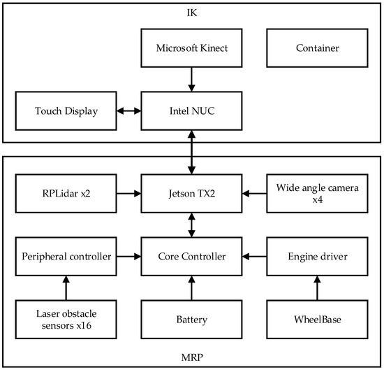 An informational kiosk (IK) is a unit equipped with hardware as well as software and devices for human-machine interaction within a container block. IK unit contains modules responsible for human-machine interaction, such as a computing unit Intel NUC, wide-angle cameras, a touch screen, and the Kinect module. The IK information being displayed on the touch screen and obtained from the Kinect module is processed in the embedded computing unit Intel NUC. In turn, the computing units of MRP and IK communicate through a dedicated LAN connection. The interaction workflow of MRP and IK components is illustrated in Figure 2 below.