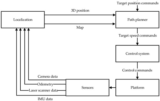 Lidar data in the form of sensor_msgs/LaserScan messages are published in ROS [48], as well as the odometry data, captured with Hall sensors and published as a nav_msgs/Odometry message. Furthermore, this information is utilized in the localization module for mapping, further transfer of mapping data into the motion planner for indoor navigation of the platform. The control system receives target instructions from the motion planner, and then it sends final instructions concerning motion velocity in the geometry_msgs/Twist message to the coordinate system of the platform.