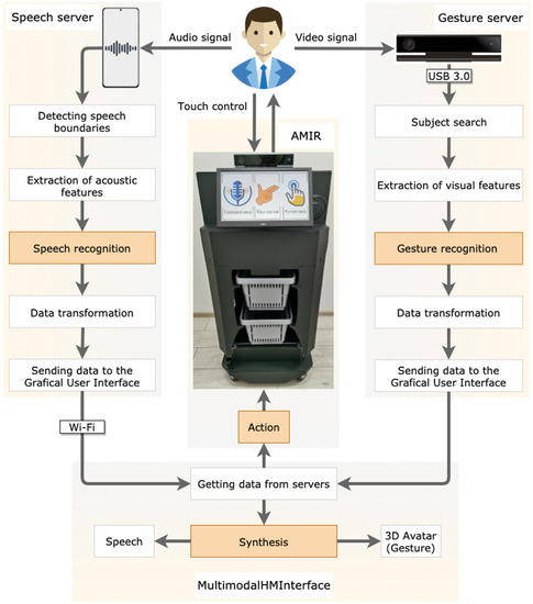 The block diagram of the architecture of the user’s interaction with the AMIR prototype is presented in Figure 4. The whole interaction process is carried out with a multimodal (touch, gesture, and speech) human-machine interface (MultimodalHMIinterface) software package.