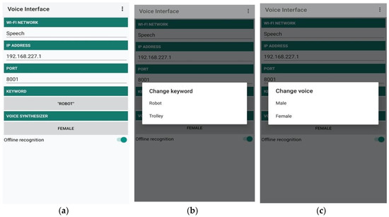 The users can change a keyword. The default keyword is “Robot”. In order to choose the keyword, the user should touch the corresponding field in the “Keyword” section. The menu for choosing the keyword is presented in Figure 6b. The user can set one of the following keywords: “Poбoт” (“Robot”) or “Teлeжкa” (“Cart”). Functionally, both keywords are recognition activation words, according to the user’s preference. The user can also choose the synthetic voice. There are two choices: male and female synthetic voice. The last item on the menu is the choice between online and offline speech recognition. In offline mode, speech recognition is carried out without using the Internet. Activation of offline mode is performed by touching the switch “Offline recognition”. Offline speech recognition allows processing continuous speech without an Internet connection, which speeds up the speech recognition process. However, it is worth mentioning that for the offline mode, the user must first download the language pack for the Russian language provided by Google to his/her smartphone, which is a shortened version of the online recognition language pack.