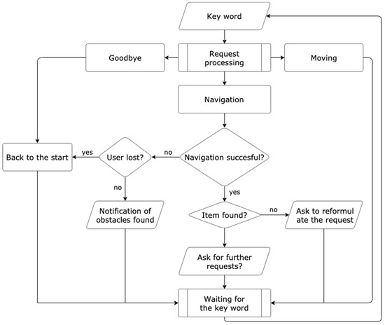Below in Figure 7, a general flowchart of the robot’s actions is given. After successful processing of the request, the robot starts moving around the store, using a map of the area, and continuous estimation of location based on the Monte Carlo method [55,56] is being performed. After completing a dialogue interaction flow cycle (user request to goodbye), the robotic cart goes to the base and switches to standby mode.