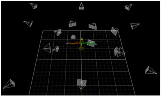 Visualization of MoCap camera layout. View from back and above and the signer is in the middle.