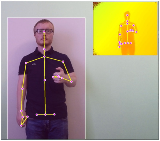The input data of the MultimodalHMInterface are video and audio signals. The Kinect v2 sensor is the device that receives the video signal (it is capable of receiving color video data and depth map). It calculates a 3-d map of the scene using a combination of RGB and infrared camera. The viewing angles are 43.5° vertically and 57° horizontally. The resolution of the video stream is 1920 × 1080 pixels with a frequency of 30 Hz (15 Hz in low light conditions). The inclination angle adjuster is pointed at changing vertical viewing angle within the range of ±27°. The color quality of the RGB video stream is 8 bits with a video stream resolution of 1920 × 1080 (Full HD) pixels and a frequency of 30 frames per second. The depth map can broadcast a transmitting video stream with a resolution of 512 × 424 pixels with 16 bits/pixel and at the same frame rate as an RGB video stream. For streaming the audio signal, a smartphone using the Android operating system is installed on AMIR. All above-mentioned receiving devices are installed on AMIR at a height between 1 and 1.5 m. The user performing interaction with AMIR has to keep the distance from the robot between 1.2 and 3.5 m. A smartphone-based application duplicates the touch screen mounted on the robotic platform prototype, allowing to switch modalities and navigate through menus.