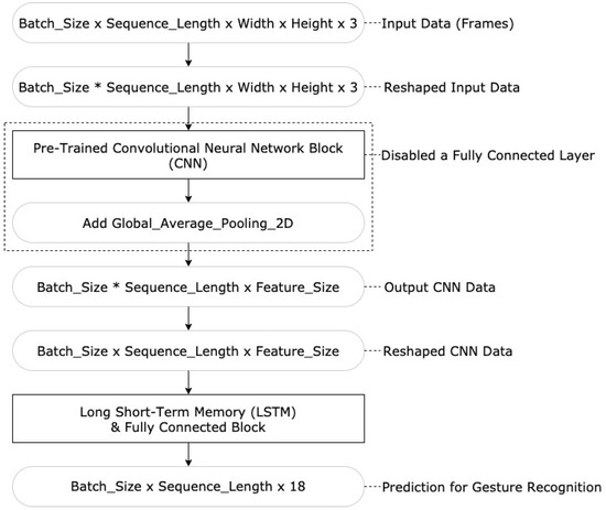 Various architectures of 2D CNNs combined with different configurations of LSTM are evaluated. All evaluated 2D CNN models tabulated in Table 2 are included in the object recognition module of the Keras open-source library [67]. The number of output clusters of the LSTM model is 512. The dropout of units is performed with 50% probability. Next, a fully connected layer is applied to the number of outputs corresponding to the number of classes, i.e., 18 gesture types. The initial hyperparameters of the learning process are the following: epoch numbers equal to 30, the Adam optimizer with learning rate equal to 0.001. The learning process is stopped when accuracy on the validation set does not increase in three consecutive epochs.