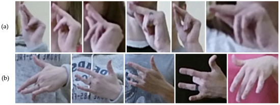 At the second stage, the hand orientation parameter is addressed. The standard HamNoSys classification introduces 18 spatial axes of hands and eight palm orientations [66]. Such instrumentation, being quite a powerful tool, is not appropriate for our purposes, and that’s why the annotation procedure is reduced to identifying different projections of handshapes. Handshape projections, as such, are combinations of hand configurations and hand orientation. A total of 44 projections are obtained that can be used for machine learning classification tasks. An example of different projections of two different hand configurations is given in Figure 14 below: