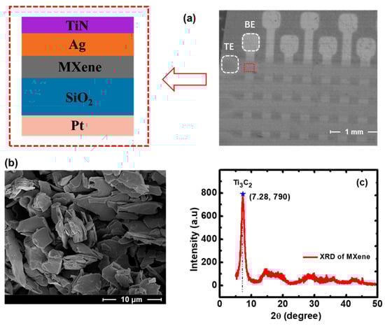 The studied Ag/MXene/SiO2/Pt RRAM devices were successfully fabricated on Si wafer. Figure 1a shows the scanning electron microscope (SEM) image of the crossbar structure of devices that are more likely to be integrated and extended with the conventional silicon CMOS fabrication technology. The vertical lines of the array are bottom electrodes of 90-nm-thick Pt and the parallel lines are top electrodes of TiN/Ag (80 nm/100 nm). Pads (300 μm × 300 μm) are illustrated by white dashed lines. The red dashed line frames the core intersection region (100 μm × 100 μm) of top and bottom electrodes, where the RS occurs. The 80 nm RS layer of SiO2 film was sputtered using the physical vapor deposition (PVD) method. The MXene (Ti3C2) layer on SiO2, prepared by etching Ti3AlC2 with hydrogen fluoride (HF), was deposited by spin-coating at 500 rpm for 60 s. The cross-sectional SEM image indicates that the thickness of the MXene film is about 50 nm, as shown in Figure S1. The surface morphology of Ti3C2 powder was characterized by SEM (Figure 1b) showing the chip-like multi-layered nanostructure. The X-ray diffraction (XRD) figure indicates that the main component of the MXene used in our experiment is Ti3C2 [44,45,46], as shown in Figure 1c. All the electrical characteristic measurements were performed by Keithley 4200A SCS semiconductor parameter analyzer.
