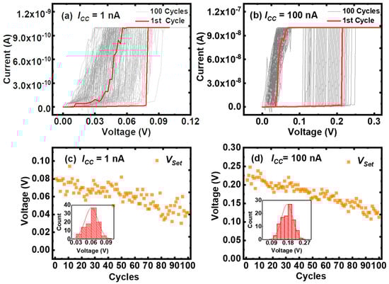 Typical threshold switching (TS) I-V curves under the compliance current limits of (a) 1 and (b) 100 nA. The statistics and distribution of Set voltages under the compliance current limits of (c) 1 nA, most of values are around 0.06 V, and (d) 100 nA, the values of Set voltages are observed around 0.18 V.