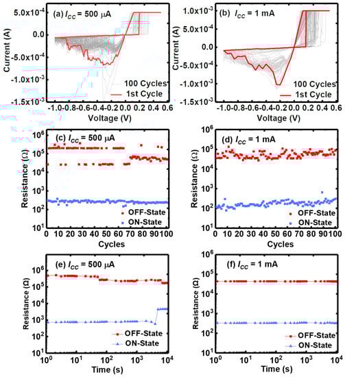 Typical resistance switching (RS) I-V curves of 100 consecutive cycles (gray curves) under the compliance current limits of (a) 500 μA and (b) 1 mA, respectively. ON and OFF resistance states during 100 cycles under the compliance current limit of (c) 500 μA and (d) 1 mA, respectively, extracted at 0.01 V. The data retention under the compliance current limits of (e) 500 μA and (f) 1 mA for the same device.