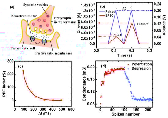 In biological synapses, once the action potential (AP) arrives at the presynaptic nerve terminal, excitatory postsynaptic current (EPSC) would generate with the open of ion channels of Na+ in postsynaptic membranes, which causes the change of synaptic weight between two neurons, as shown in Figure 4a [4,5]. As a pair of identical pulses is given to the presynaptic nerve terminal, EPSC-2 caused by the second pulse is significantly enhanced. This phenomenon is called paired-pulse facilitation (PPF) of synapses, an important characteristic of STP [49,50]. Hereby, we simulated the PPF characteristic in Ag/MXene/SiO2/Pt RRAM devices. A pair of spikes with the pulse amplitude of 0.2 V and pulse width of 90 ms was applied to the Ag/MXene/SiO2/Pt device, and the corresponding responses of the PPF characteristic are obtained, as shown in Figure 4b. It can be observed that EPSC-2 is much larger than EPSC-1 caused by the first pulse, which is consistent with the phenomenon of biological synaptic plasticity [51,52]. The PPF characteristic can be better elucidated by considering the change between two peak currents of EPSC-2 and EPSC-1 induced by a pair of identical pulses versus the interval time (). As shown in Figure 4c, the index of exponentially decreases with increasing, and are the values of the peak currents after the first and second pulses, respectively. In this experiment, the index of PPF can be fitted with the following equation:
