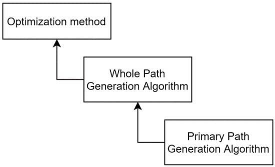 In the literature, the recent research is focused on searching for the victim and on the travel in general [18,19,20,21]. The problem often is not considered under the travel time condition. The aim of the research is to develop a fast method to obtain travel time-optimized paths in an a priori known environment or in an environment previously mapped by the robot itself. Two path finding methods are presented in the paper. The first one is based on a genetic algorithm and the second one on a random search algorithm. Each method is described in two versions: with path fitness estimation and with travel time obtained from a velocity profile generator. Both methods are designed in a specified hierarchy, which is presented in Figure 1. It resulted from the analysis of effects presented in the paper [4], which showed the limitations of the methods that operate directly on the path shape. The main limitation is a constant complexity of the path (i.e., constant control points number). To overcome that inconvenience, another approach was chosen: the optimization method, which does not operate on path parameters itself, but on the parameters of a whole path generation algorithm (WPGA). The WPGA creates the path from parts of primary paths that are chosen as locally optimal. An important aspect about the primary path generation algorithm (PPGA) is that the path is chosen by the algorithm from a discrete set of paths. This reduction of a solution space significantly improves the performance of the method.