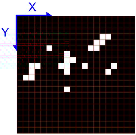The algorithm is executed as soon as the environment map was obtained. Due to the long execution time, the work on an a priori known map is acceptable only. It is unfit for real time use. The map is modelled as a binary bitmap with terrain approximated as a flat space (Figure 2). The raster of the map is marked by red grid lines. In the maps presented in the paper, as well as the axes, it will be hidden for clarity. The dark pixels are considered as obstacle-free and the bright ones as inaccessible for a robot. It is assumed that size of one pixel is large enough to be able to contain the whole robot with a safety margin. However, the raster maps have a large disadvantage—their size is usually constant. To overcome it, fields with obstacles are firstly saved as a list of points. Then, it is rasterized. It allows to the map size to be adjusted for all the obstacles. Of course, the point list could be used without rasterization, although the collision detection in this case needs to check the whole obstacles list for every pixel of rasterized path or to do the geometrical collision detection for every path segment. The collision detection on raster map needs much fewer tests. It affects performance significantly.