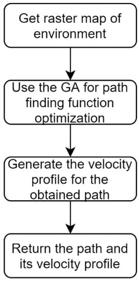 Many methods are developed to solve the path finding problem. One of the most known is the A* algorithm [1]. It needs the map to be represented as a graph. The result path is discrete and has to be processed to be useful for rover-like robots. Other proposed methods in the literature use artificial neural networks [2,3]. Their main disadvantages are the teaching process and the modelling problem, so they are difficult to use for global path optimization. Other optimization methods are also frequently used for path finding. Genetic algorithms [4,5,6,7,8], evolutionary algorithms [9], particle swarm optimization [10,11], and ant colony optimization [12] can be indicated as examples. Some popular methods used for path finding are fuzzy logic [13], potential fields [14], and combining these [15,16] or other hybrid ones [17]. The methods mentioned above often look for the shortest path or are strictly focused on the avoidance of obstacles. As the shortest path is not always the fastest one, the problem of finding paths under the shortest travel time criterion remains an interesting field for the research, whose importance can increase with the increasing global usage of mobile robots.