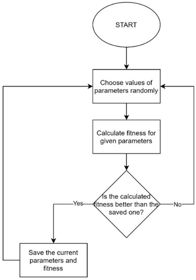 The random search algorithm (Figure 4) is simple. At the first step, the solution parameters are chosen randomly. Then, the fitness of the solution is calculated. Those parameters and fitness values are saved as current ones. At the second step, the process of getting parameters randomly for a new set and fitness calculation for it is done again. If the new solution has better fitness than the current one, it is set as a current. The last step is repeated until the given number of epochs will be satisfied. Then, the current solution is returned as a result.