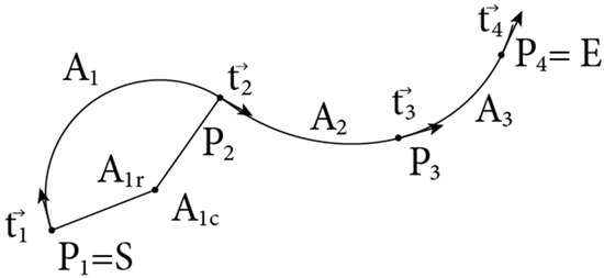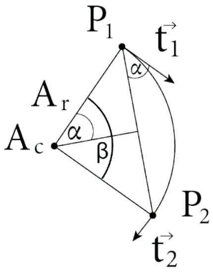 Before computation of each segment, it needs to be check, whether the segment belongs to straight or to arc segment category. It is done by comparison of two unitized vectors: tangent vector (Equation (4)) and vector of start and end point (Equation (3)). For segment they are described as follows: