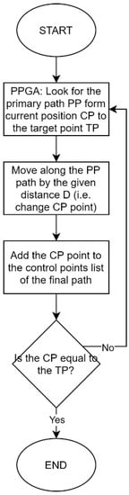 The idea is to look for the locally best short path, then move along it some distance and, if it is not a target point, repeat the process. The path generation algorithm consists of two parts: primary path generation algorithm (PPGA) and whole path generation algorithm (WPGA). The first part returns the local path and the second one uses the PPGA to make a path from start to end point. The WPGA flowchart is presented in Figure 7.