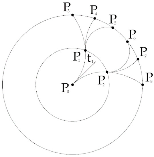 In the method proposed in this paper, the prototype path exploits the control points that lie on the circular layers (Figure 8) around the start point and are distributed equidistantly on both sides of the initial tangent vector.