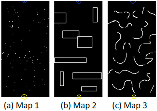 For the purpose of the test, three different maps are used (Figure 13). The first map simulates the forest environment with the randomly distributed trees. The second simulates an area with some buildings or boxes. The third map is designed to test the methods in some kind of complex environment, in which it is necessary to produce a complex path with many bends. The start point is marked by blue cross inside of the blue circle and the target point is marked by yellow cross inside of the yellow circle. In the maps with paths, the start and target points markings are omitted.