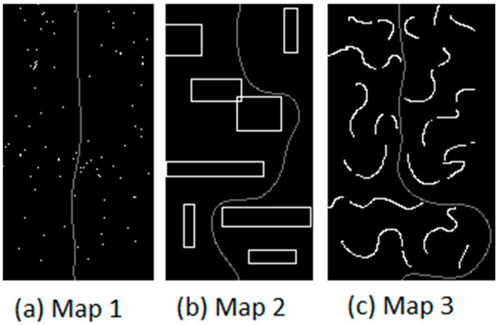 There are two methods: the genetic algorithm and the random-search, each in two versions: first, using an estimated path fitness, and second, using travel time fitness from velocity profile generator. It gives four algorithms to be tested. For each test, two values are saved: time of algorithm execution and result travel time. The travel time is computed using the above-mentioned velocity profile generator. All the tests were performed on the same platform: PC computer with AMD Ryzen 5 3600X processor (TSMC, Hsinchu, Taiwan). The algorithms are implemented in Python 3.6. All the computations are performed in single thread. The robot always starts in the middle of the top of the map and the target point is in the middle of the bottom of the map. Each map is of the same dimensions—100 × 200 px.