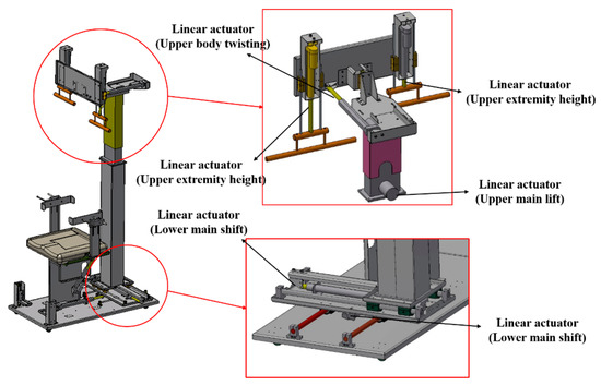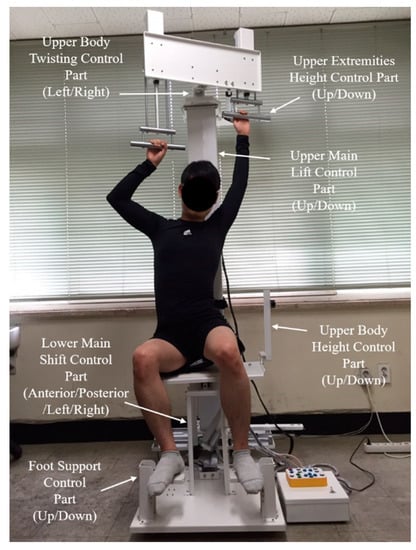 The exercise rehabilitation device was manufactured to provide customized exercise to strengthen a relatively weak side by considering five principles for correction: axial elongation (vertical spine stretches), derotation (axial rotation of the spine), deflexion (displacement of the hump to the opposite side), facilitation (correction for the proper effect of exercise on the weak side), and stabilization (maintenance of correct posture). To facilitate the active movement of the trunk segments, it consists of six major components: upper main lift control (up/down) part, lower main shift control (anterior/posterior/left/right) part, upper body height control (up/down) part, upper body twisting control (left/right) part, upper extremities height control (up/down) part and foot support height control (up/down) part, as shown in Figure 3.