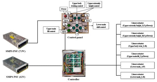 As shown in Figure 1, the exercise rehabilitation device was designed using CATIA V5 R18 (Dassault Systems, Vélizy-Villacoublay, France). This device was manufactured by utilizing steel sheets and aluminum materials for rigidity. In addition, wheels for easy movement were attached to the bottom of the device. To provide the rotation, tilting, and movement of the upper and lower part of the trunk, six electric actuators were installed. A motor drive-type linear actuator, with a maximum load of 2000 N and speed of 90 mm/s, was used to generate linear motion while providing active movement of the upper and lower trunk during exercise. A motor drive module and control panel was developed to control the actuator installed in each joint of the device. A multi-contact type relay was used to activate each motor with a normal and reverse rotation function. This exercise rehabilitation device can be operated by pressing the button in the control panel to input the exercise method for correction of the spine, as shown in Figure 2.
