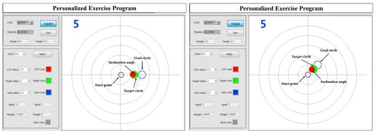 Table 1 presents a personalized exercise method. The static stretching exercise (chest and back stretching) is performed during the warm-up and cool-down periods. Patients were instructed to elongate the trunk as much as possible by elevating gradually the upper limb lift control part, and then maintain the maximum elongation for 10 s. To provide a specific exercise method for correcting asymmetrical postural balance caused by scoliosis when performing pelvic tilt exercise, a sitting posture monitoring device was utilized. This device, which was designed as a hemisphere to perform personalized exercise program based on the inclination angle, has a soft curve shape to accommodate the hip area and seat surface was covered with soft material to provide comfort during sitting []. It was linked to a training program which was developed using LabVIEW software (National Instruments Co., Austin, TX, USA). This program displays the horizontal movement of the inclination angle, target circle and goal circle.