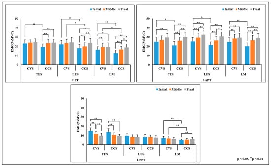 Differences in the muscle activities between the CVS and CCS are presented in Figure 5. In LPT, all activities of TES, LES, and LM muscle among the initial, middle and final test were increased both for the CVS and CCS. On the CVS, there were no significant differences in the activity of TES and LES muscle among the initial, middle and final test. In contrast, on the CCS, when comparing to the initial test, a significant increase in the activity of TES muscle was found in the middle (21.56%) and final (24.37%) test (p < 0.01). The activity of LES muscle increased significantly in the middle (10.54%) and final (32.25%) test (p < 0.05 and p < 0.01, respectively). The activity of LES muscle in the final (19.64%) test also increased significantly compared to the middle test (p < 0.01). The activity of LM muscle on the CVS increased significantly in the middle (16.76%) and final (16.80%) test compared to the initial test (p < 0.05 and p < 0.01, respectively). When comparing the initial test, on the CCS, the activity of LM muscle more increased significantly in the middle (30.62%) and final (46.89%) test than the CVS (p < 0.01). The activity of LM muscle in the final (12.46%) test increased significantly compared to the middle test (p < 0.01). In addition, in the initial test, the significant differences in the muscle activity between the CVS and CCS were shown in all muscles (p < 0.01). On the contrary, in the middle test, there were significant differences in the activity of LES and LM muscle between the CVS and CCS (p < 0.05). On the other hand, in the final test, there were no significant differences in the activity of all muscles between the CVS and CCS. In LAPT, all activities of TES, LES, and LM muscle among the initial, middle and final test were increased both for the CVS and CCS. On the CVS, the activity of TES muscle increased in the middle (7.15%) and final (17.87%) test compared to the initial test. However, a significant increase in muscle activity was only shown in the final test (p < 0.01). The activity of TES muscle also increased significantly in the final test (10.00%) compared to the middle test (p < 0.01). On the CCS, a significant increase in the activity of LES muscle was found in the middle (23.26%) and final (42.28%) test compared to the initial test (p < 0.01). The activity of LES muscle in the final (15.44%) test also increased significantly compared to the middle test (p < 0.01). Unlike the results in the TES and LES muscle, a significant increase in the activities of LM muscle was shown in all periods both for the CVS and CCS. On the CVS, the activity of LM muscle increased significantly in the middle (15.38%) and final (3.27%) test compared to the middle test (p < 0.01). On the CCS, the activity of LM muscle increased significantly in the middle (32.31%) and final (43.98%) test compared to the initial test (p < 0.01). The activity of LM muscle also increased significantly in the final (8.81%) test compared to the middle test (p < 0.01). The significant differences in the activity of all muscles between the CVS and CCS were only shown in the initial test (p < 0.01). In LPPT, the overall tendency in the activity of all muscles was decreased gradually after performing the personalized exercise. On the CVS, a significant decrease in the activity of TES muscle was found in the middle (22.46%) and final (34.36%) test compared to the initial test (p < 0.01). When comparing the middle test, the activity of TES muscle also decreased significantly in the final (15.34%) test (p < 0.01). On the CCS, the activity of TES muscle increased significantly in the middle (22.99%) and final (28.89%) test compared to the initial test (p < 0.01). However, there was no significant decrease in the activity of TES muscle between the middle and final test. On the other hand, the activity of LES muscle among the initial, middle and final test decreased both for the CVS and CCS, while there were no significant differences in the muscle activity between periods. The activity of LM muscle among the initial, middle and final test decreased on the CVS while it increased on the CCS. A significant increase in the activity of LM muscle was shown in the final (21.08%) test compared to the initial test (p < 0.01). Additionally, when comparing the middle test, the activity of LM muscle also increased significantly in the final (11.67%) test (p < 0.05).