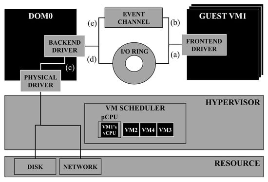 The major mechanisms involved in Xen’s I/O procedure are the shared ring buffer and event channel [,,,,]. The shared ring buffer provides a shared memory communication mechanism that is used for communication among VMs and between DOM0 and guest VMs. An event channel exists in each VM, including DOM0, and it performs an asynchronous I/O notification mechanism for the arrival of I/O requests or I/O respond. The overall I/O process of Xen is as follows: