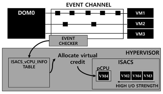 Kim et al. [] proposed a guest-aware scheduling method to provide an awareness of the I/O degree of VMs to a hypervisor by modifying the kernel of the guest VMs. They inspected the information of the blocked tasks that await an I/O response to the operating system of the guest, and then, shared the task information in the blocked state of the specific VM with the hypervisor. Then, a high scheduling priority was given to the specific VM with high blocking levels to ensure pCPU preoccupation and increase I/O performance. However, modifying the VM’s I/O device driver takes a lot of code modification at a high cost and is less portable. ISACS tracks I/O information from all I/O device drivers wherein the event channel, which is the above layer of all I/O device drivers, making it more portable and less costly to modify.