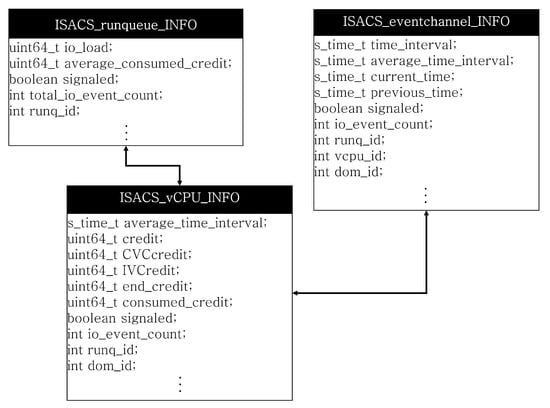 In the split-driver architecture of Xen, the asynchronous I/O notification mechanism based of the event channel and vCPU scheduling are independently executed over different areas; thus, the event channel cannot know the scheduling information for each vCPU, and the scheduler cannot know the number of I/O response events occurring for each vCPU [,,,]. Furthermore, credit reallocation for each run-queue in the Credit2 scheduler is independently performed. This is because it depends on the number of vCPUs waiting for scheduling and because the degree of credit consumption of each vCPU placed in the run-queue depends on the workload distribution trend of each vCPU. To integrate the up-to-date status information of vCPUs that can be obtained from these three independent areas and expand the range of scheduling parameters that can be derived, ISACS manages the extended vCPU scheduling structure ISACS_vCPU_INFO, which can allow bidirectional communication through shared memory communication. Figure 3 shows the structure of the scheduling parameter of ISACS. ISACS_vCPU_INFO in Figure 3 is configured based on the extended scheduling information of the vCPU. ISACS_vCPU_INFO consolidates and maintains the up-to-date information of the vCPU regarding I/O response events, which can be obtained from the event channel through the shared memory mechanism and the run-queue information, which is that the vCPU is assigned. Thus, in ISACS, the event channel and scheduler can recognize each other’s existence and keep up-to-date status of three areas including run-queue information.