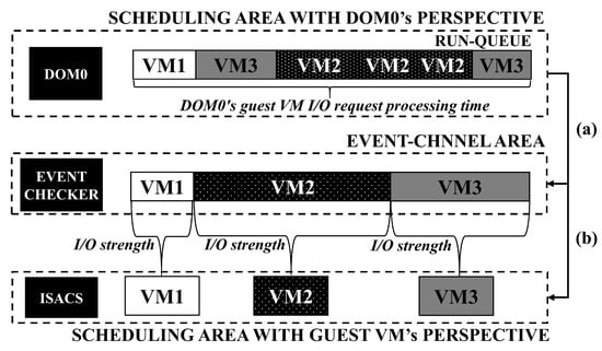 Figure 4 shows the procedure of measuring the I/O strength of each vCPU of the VM in ISACS. The first dotted box at the top of Figure 4 depicts the perspective of only DOM0 processing the I/O requests of each VM. The boxes in the run-queue indicate the amount of time for which DOM0’s vCPU has processed I/O requests received from a specific VM. The second dotted box at the top in Figure 4 shows an amount of accumulated time interval in which DOM0 generates an I/O response event for each VM’s I/O request based on a split-driver mechanism. Here, the EVENT CHECKER tracks the vCPUs receiving the I/O response event and derive the average interval of the I/O respond events with EMA applied. The third dotted box at the top indicates the process of allocating IVCredits according to the I/O strength by leveraging the ISACS_vCPU_INFO structure, which is synchronized with the EVENT CHECKER through shared memory communication. At this time, the VM box indicates the I/O-intensive vCPU of a specific VM which receives and handles the I/O response event from DOM0. As shown in Figure 4, the I/O strength of the vCPU is determined by the processing time of DOM0 for I/O requests of VMs, which has the same meaning for the interval between I/O response events from DOM0 to VM in ISACS. In Figure 4a,b represent the procedure corresponding to Equations (1) and (2) respectively.