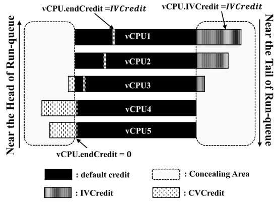 In the previous section, we described equations to derive the amount of virtual credits, such as IVCredit and CVCredit, according to the degree of workload and workload type of the vCPU unit. However, a vCPU that is assigned an IVCredit can have more credits than a neighbor vCPU. Therefore, a fair pCPU run-time for each vCPU is not guaranteed, and this can lead to biases in I/O and CPU performance. For example, when allocating IVCredits to vCPUs, I/O-intensive vCPUs obtain more credits than the CPU-intensive ones, resulting in unfair pCPU run-time. Therefore, ISACS should ensure that all vCPUs in the run-queue have the same amount of credit as much as possible. To avoid unfair pCPU run-time over all vCPUs in the run-queue, ISACS adopts a credit concealing method for all vCPUs to allocate a fair amount of credit for all vCPUs in the run-queue. In this section, we explain the credit concealing method that mitigates the unfairness arising from the amount of credit allocated to each vCPU placed in the same run-queue. This method provides a fair pCPU run-time for each vCPU by defining the limit of the amount of credit that can be consumed by considering the type of virtual credit.