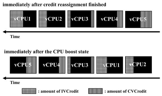 The Credit2 scheduler first schedules the vCPU that has a high amount of credits. ISACS leverages this scheduling policy to increase the probability of preempting the pCPU for I/O-intensive vCPUs using a credit concealing method. Figure 5 shows the result of the credit concealing method after credit reallocation. The concealing area refers to the virtual credit provided by ISACS. For concealing area in the Figure 5, vCPU1 and vCPU2 are I/O-intensive vCPUs and have an IVCredit granted by ISACS. vCPU4 and vCPU5 are CPU-intensive vCPUs and are allocated a CVCredit by ISACS to guarantee the CPU performance. vCPU3, unlike vCPU1 and vCPU2, meets Equation (3) for the average IVCredit in the run-queue. Therefore, IVCredit and CVCredit together represent the assigned state. In the Credit2 scheduler, all vCPUs inside the run-queue are assigned a default credit when the credit amount for the next scheduled vCPU is less than zero. Therefore, for the credit reallocation condition in the Credit2 scheduler, we can state that . When IVCredit is assigned to the I/O-intensive vCPU, we get . However, if the credit reallocation condition is less than IVCredit and not zero, then . is erased from both sides of the credit reallocation condition; thus, . Therefore, in ISACS, all vCPUs in the run-queue takes the same amount of credits whenever credit reallocation is performed, regardless of the type of workload that each vCPU handles when ISACS is not in CPU-BOOST STATE. ISACS guarantees that the same amount of credit can be assigned to all vCPUs in the run-queue by ensuring that credit reallocation is performed when the amount of credit is less than the value of vCPU.endcredit in Figure 5, not when the amount of credit is less than zero.