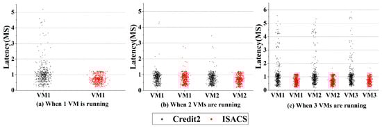 Figure 7 shows the distribution of network latency for the Ping test when one network-intensive VM to three network-intensive VMs are executed. The experimental results show that ISACS generally has a lower network latency than the existing environment. In Figure 7a, the tail latency emerges in the existing environment including Figure 7c. However, in ISACS, a small tail latency exists on n Figure 7c and the maximum tail latency at VM3 is 1.68 ms; in contrast, in the existing environment, the maximum tail latency is 5.87 ms on VM3. Table 3 shows the average network latency according to the VM configuration in the hybrid environment based on Figure 7. The network latency in ISACS is approximately 43% lower than that in the existing environment when running 1 VM, and it is 55% lower when 3 VMs are employed. However, when running 2 VMs, a small difference exists in network latency between ISACS and the existing environment.