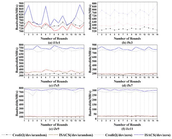 Figure 12 shows the disk I/O bandwidth results for each round of the experiment, and Table 8 presents the average disk I/O bandwidth for ISACS and the existing environment, which is also shown in Figure 12. The results of the experiment show that the overall degree of the disk I/O bandwidth of ISACS is higher than that of the existing environment. However, the degree of the disk I/O bandwidth for /dev/urandom was not significantly high. The reason for the low degree of disk I/O bandwidth improvement in /dev/urandom is that the processing cost for random number generation in /dev/urandom, as discussed in Section 5.3.1, is high, resulting in a lack of I/O response event information, which weakens the I/O intensity awareness of ISACS. Therefore, we will not discuss the results of the DD experiment for /dev/urandom herein because the increase in disk bandwidth is too low.